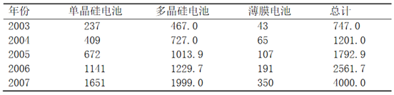 提高光電轉換效率和降低生產成本。太陽能光伏電池通常用晶體硅或薄膜材料制造,前者由切割、鑄錠或者鍛造的方法獲得,后者是一層薄膜附著在低價的襯背上。晶體硅仍是當前太陽能光伏電池的主流。晶體硅電池包括單晶硅太陽電池和多晶硅太陽電池。單晶硅電池的實驗室*高轉換效率可達24.7%,商業化電池效率為16%~20%。多晶硅太陽能電池的實驗室*高效率也超過了20%,商業化電池效率為15%~18%。除效率外,電池的厚度也很重要。降低硅片厚度是減少硅材料消耗、降低晶硅太陽電池成本的有效技術措施。硅片的平均厚度已從2003年的0.23mm減小到2007年的0.18mm。下表為2003—2007年各類太陽能產量MW
