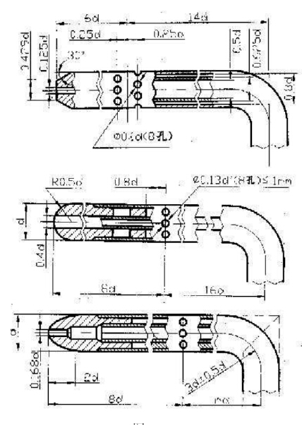 上圖是一般皮托管的結構,為了能看清,把兩端放大。如圖中可以看到皮托管外形是一個L型的金屬管,與管軸平行安置的直角邊是測頭,其頂端有一個總壓孔,在其側壁上有若干個靜壓孔。總壓孔與靜壓孔不相通,分別用導壓管引出,從靜壓孔至總壓孔稱為鼻端。直角的另一邊稱為支桿,引出總壓孔和靜壓孔的接頭以便與微壓計的管相連接。其上有定向桿,指示鼻端方向。測量總壓力的管子叫皮托管,測量靜壓力的管子叫靜壓管。實際上常用的都是皮托管和靜壓管的組合,而且多數使用實驗系數接近為1的形狀,也*是國際標準推薦的GETIAT(錐形頭)型,AMCA型(球形頭),MPL型(橢圓形頭三種),如下圖所示