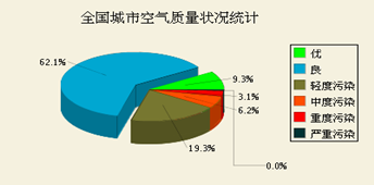 7月7日全國城市空氣質(zhì)量日?qǐng)?bào)對(duì)全國城市空氣質(zhì)量狀況的檢測(cè)結(jié)果做了詳細(xì)的介紹,其中監(jiān)測(cè)指標(biāo)為空氣質(zhì)量指數(shù),即air quality index(AQI)。其中,3.1%的城市為重度污染,6.2%的城市為中度污染,19.3%的城市為輕度污染,62.1%的城市空氣質(zhì)量為良,僅有9.3%的城市空氣質(zhì)量為優(yōu)。