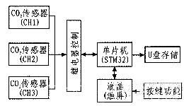 前端傳感器輸出的數字信號,以串口方式與STM32進行通訊,此儀器設計三通道采集,利用繼電器電路對傳感器通道進行選擇,STM32將濃度值顯示在液晶屏上,液晶屏帶有觸摸功能,通過編寫液晶顯示界面,調用相關按鍵程序,選擇傳感器通道以及保存為U盤數據等功能。框圖如圖1所示。