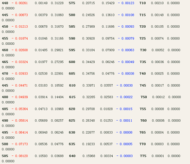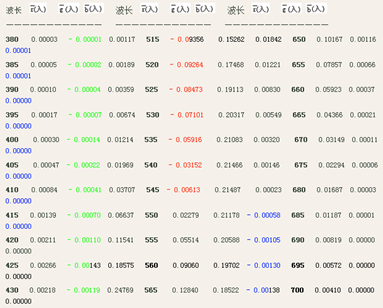 通過這一段分析可以看出,從546.1nm到690nm這一段,b的數(shù)量是由0開始增加,之后又減少,到了690nm處的時(shí)候減少到0。顯然b在這區(qū)間內(nèi)肯定要有一個(gè)*大值?,F(xiàn)在,我們來看一下“光譜三刺激值”表中的546.1nm到690nm這一段,其中起輔助作用的光的“藍(lán)原色”的數(shù)量的變化(即,藍(lán)色三刺激值的變化),不*是這樣的一種情形嗎?它有一個(gè)*大值*發(fā)生在545nm處,數(shù)值的大小是0.00138(在表中我們對這個(gè)*大值中的138標(biāo)了黑色,目的為了便于重新查找它。至于這個(gè)“刺激值”的負(fù)號(hào)來源,也*無需再作解釋了)。